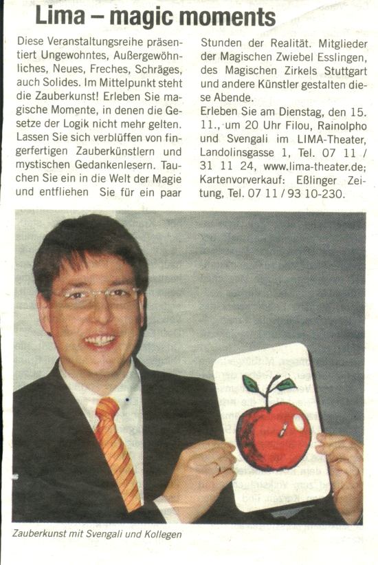"...zu dem grossen Erfolg des 'Tag der Begegnung' am 01.09.02 haben Sie mit Ihrem unentgellichen Auftritt als Zauberer beigetragen. Dafür dürfen wir nochmals unseren herzlichen Dank übermitteln [...] Wir hoffen, dass auch Ihnen das Tierheimfest ein wenig Freude bereitet hat und würden uns freuen, Sie auch im nächsten Jahr am 7.9.03 wieder als Zauberer zu sehen...." Aus dem Schreiben des Tierschutzverein Esslingen und Umgebung e.V. vom 23.9.02